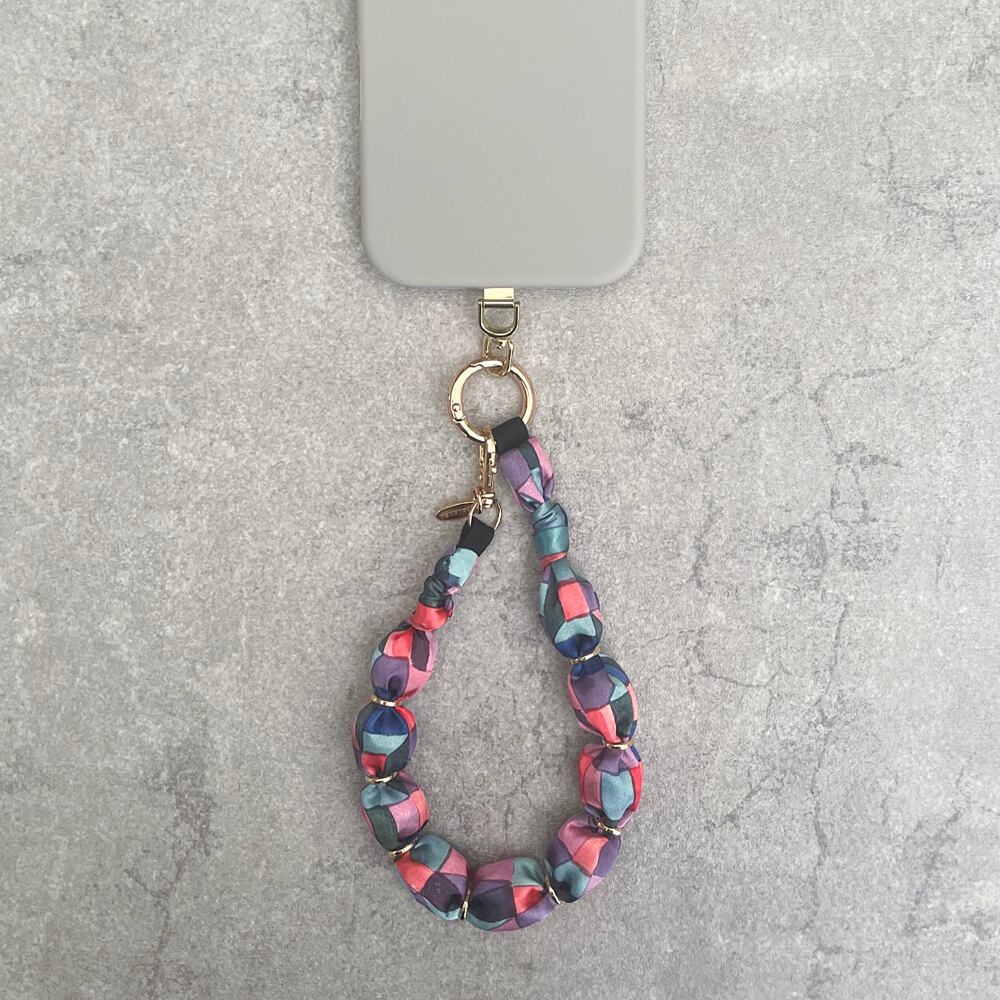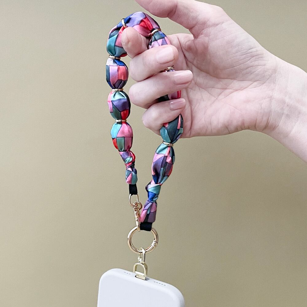 サテン生地で包んだビーズを連ねた、アクセサリーのようなスマートフォンストラップ。